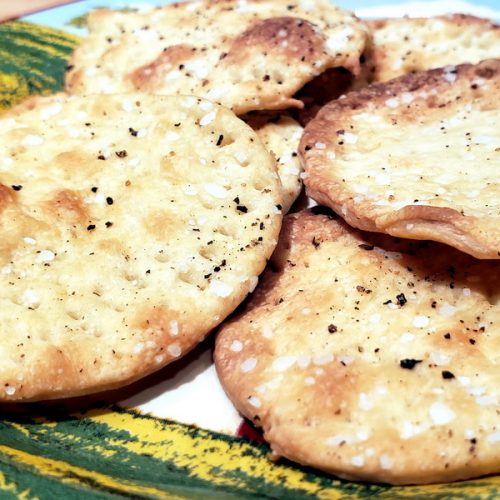 This comes from a simple recipe that I found in an old book, and it makes perfectly good crackers. We’ve added cracked pepper to make them “artisan” styled, but you can add smoked paprika, garlic, curry powder — you name it — to make these crackers your own.