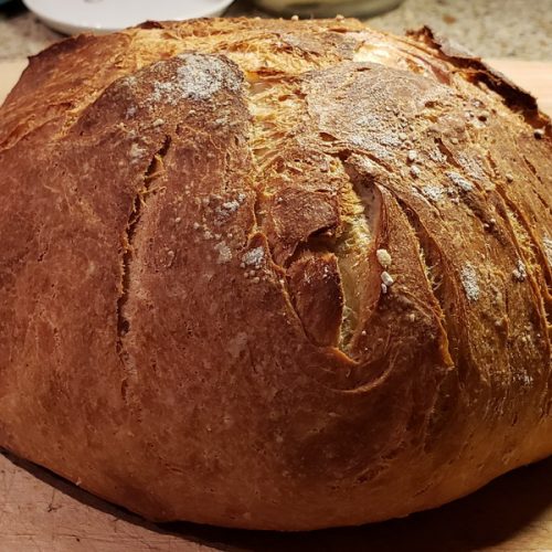 This is a fun way to make bread that you might otherwise make in a bread machine. The result is an “artisan” style bread loaf that looks like you got it from the bakery — well, you did — your bakery!