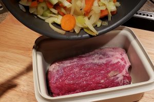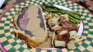 This recipe is inspired by Jennifer Patterson, one of the “Two Fat Ladies” of BBC fame. It’s essentially Beef Wellington. If you’re in a hurry, this isn’t the recipe for you. If you want a “restaurant-style” beef in pastry, stick with this one. In order to extract all the flavors of the marinade, ensure the duxelles adheres to the meat, and to make a gravy that’s “to die for,” I make this dish in stages over the course of a couple of days. You can probably shortcut the timing, but it’s well-known that many dishes are better the next day than when first made. If you take the challenge, you’ll make a beef in pastry fit for fine dining.
