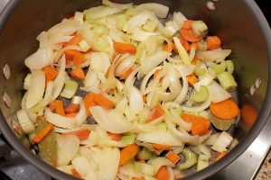 - Using the Step 2 Ingredients, rough cut vegetables. Heat the olive oil in a 5 or 6 quart pan. Add the vegetables, bay leaves, cloves, and pepper corns. Cover and simmer until the vegetables are tender. Take off the heat and let cool for about 15 minutes.