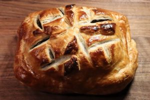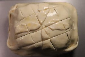 - Cut diagonal slits into the top of the pastry (don’t cut into the meat, the slits allow steam to escape). Then, using the rest of the egg wash, paint the entire outside of the pastry. The egg wash will give the cooked pastry a delicious, golden color.