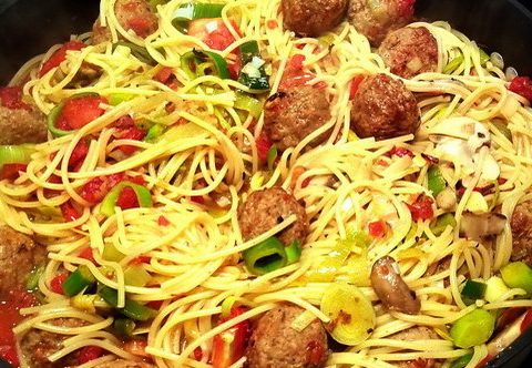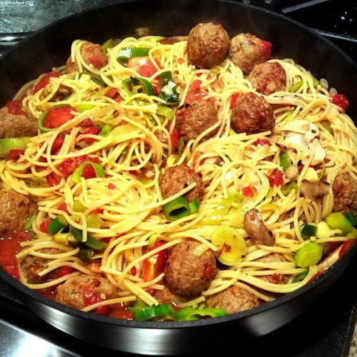 This dish came from a similar experience where I received a cookwares catalog with a picture of a pan filled with what looked like pasta and meatballs. I couldn’t find the recipe, so I guessed at the ingredients. And, like the NTE Protector, it worked like a champ!